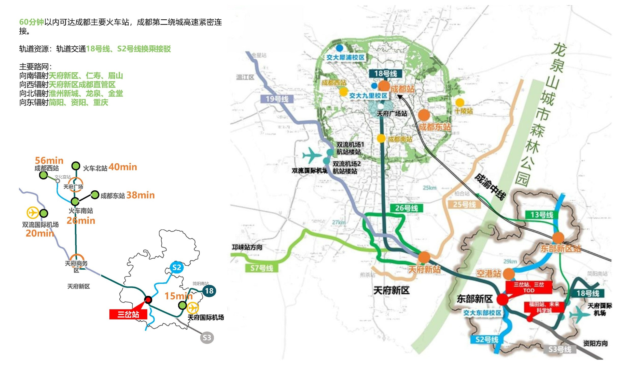 太阳集团tyc151成都东部(国际)校区开创TOD+学研+城市的城市高校建设新范本,通过地面慢行系统和空中连廊慢行系统,与三岔地铁站无缝连接,可以充分享受地铁等舒适快捷的公共交通。太阳集团tyc151成都东部(国际)校区在地铁18号线三岔站五到十分钟步行圈内,15分钟到达天府国际机场,30分钟到达成都南站,60分钟内到达成都主要的机场和火车站。