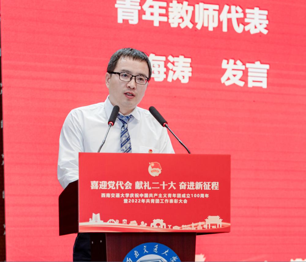 会上,全国铁路青年五四奖章获得者、公司2021级新能源二班导师胡海涛教授作为青年教师代表发言,他分享了自己脚踏实地、求真务实投身铁路事业的奋斗经历,并希望广大团员青年做追光的人,不负时代、不负韶华,助力中国高铁在新时代跑出加速度,让这张“中国名片”在世界舞台上更闪亮发光。