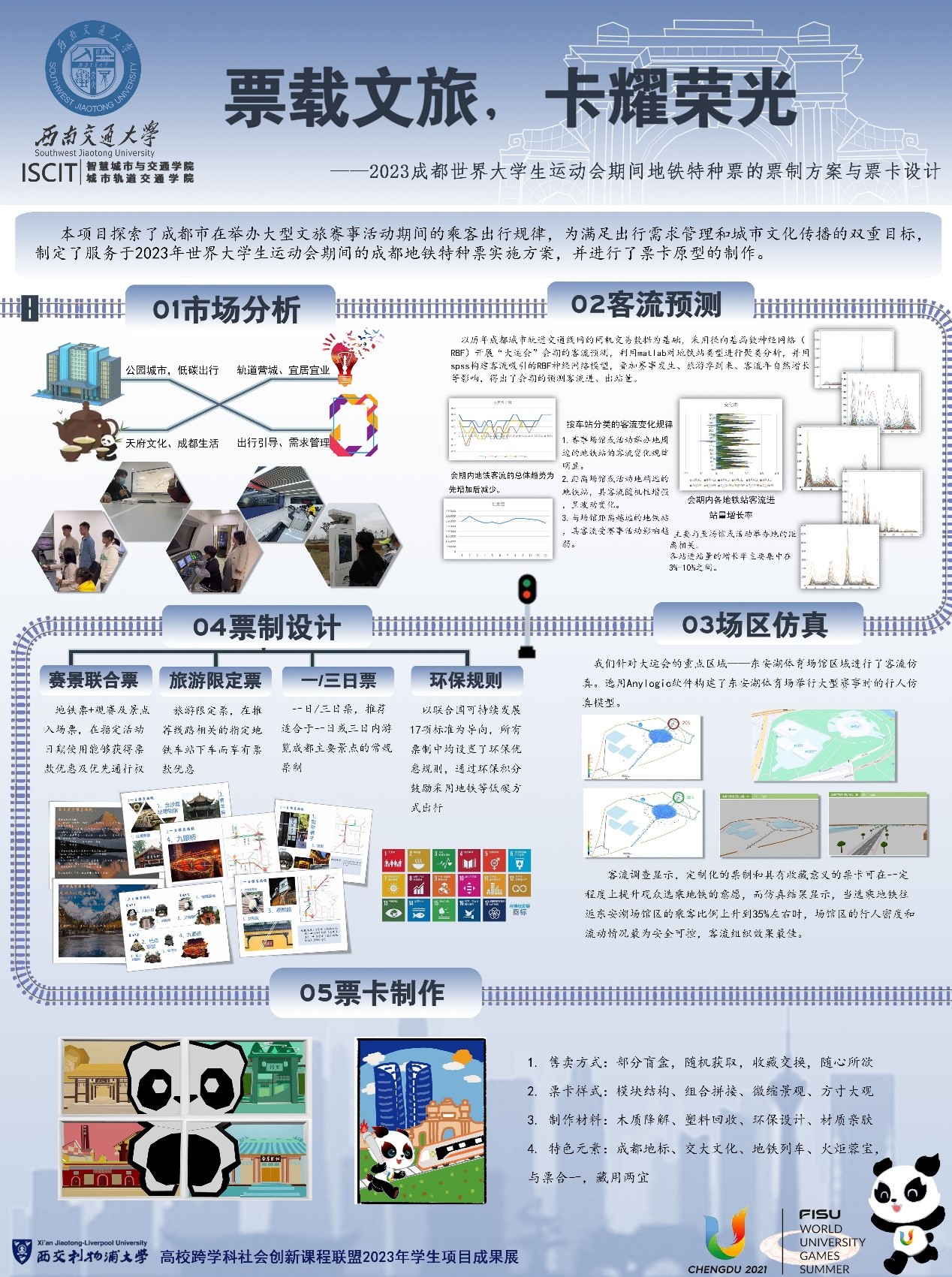 参赛项目以成都大运会为设计背景,在公司王琳老师、黄兴民老师和成都轨道集团李静博士的联合指导下,太阳集团tyc151颜晓惠、谭惠丹同学和交运公司杨渊、兰鑫锐、罗恒彧同学组成跨学科团队,利用太阳集团tyc151和交运公司相关实验室的软、硬件设备,进行了市场调研、客流预测和场区仿真,自主完成了地铁特种票的票制方案设计和票卡制作。