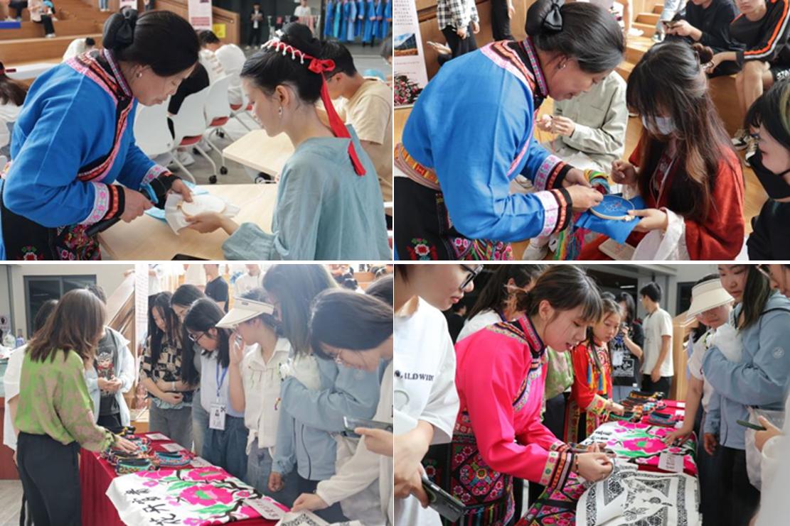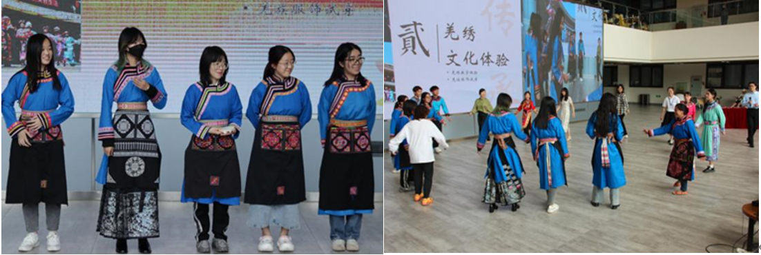 在羌绣文化体验环节,同学们兴趣盎然、积极踊跃。同学们尝试羌绣绣法教学,了解独具匠心的羌绣工艺;近距离接触羌绣作品,目睹传统文化与现代审美的完美结合;试穿羌族服饰,领略羌族服饰的精美别致。对羌族而言,审美功能与实用功能是不能截然分离的,羌族刺绣上的那些绚丽多姿的图案和羌族音乐舞蹈的明快质朴,实际上凝聚了羌族人民对生活的祈祷和祝福。随着富含羌族韵律的音乐响起,现场师生纷纷上前跳起了羌族萨朗,羌族音乐舞蹈文化所展现出的感染力,更是让在场观众感受了传统羌族文化的惊艳魅力。