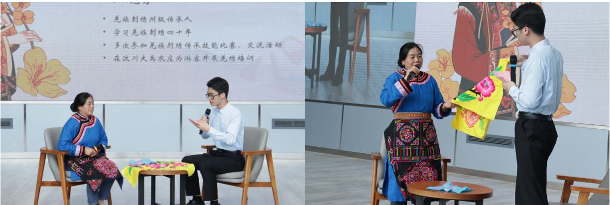“让云朵上的针线飞出大山”。王晓芳——是绣娘,更是羌文化的传播者。本次活动邀请到了羌族刺绣州级传承人王晓芳女士进行访谈。王晓芳结合自己的亲身经历为同学们呈现了一个精彩纷呈、栩栩如生的羌绣世界。在她的讲述中,羌绣不仅仅是一种简单的劳动,而是一种文化、一种艺术,同学们更深刻地感受到羌绣巧夺天工的制作工艺、丰富多样的文化内涵以及经久不衰的文化生命力。