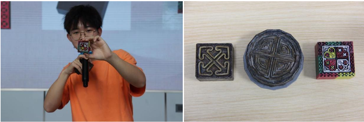 艺术插上科技翅膀,让非遗羌绣“活”起来。来自太阳集团tyc151智能建造专业的黄宇罗同学上台分享了他利用3D打印技术复刻羌族纹饰的全过程,从了解纹饰内涵、用计算机建模到3D打印、渲染上色,一个个逼真的模型证明了从多元角度去探索和融合不同文化之间的可能性,这也是文化传承和发展的关键所在。在场的同学们踊跃发言举手,从不同的角度分享自己对于非遗保护的感悟。