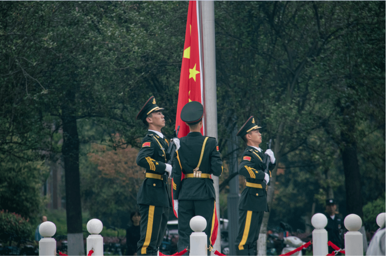 8时整,公司国旗护卫队的队员们步伐划一、眼神坚定,将国旗护送至旗台。伴随着响彻云霄的国歌歌声,鲜艳的五星红旗冉冉升起。