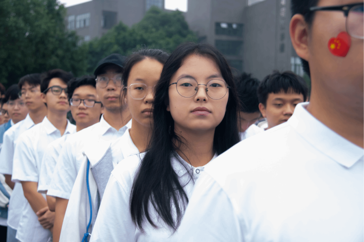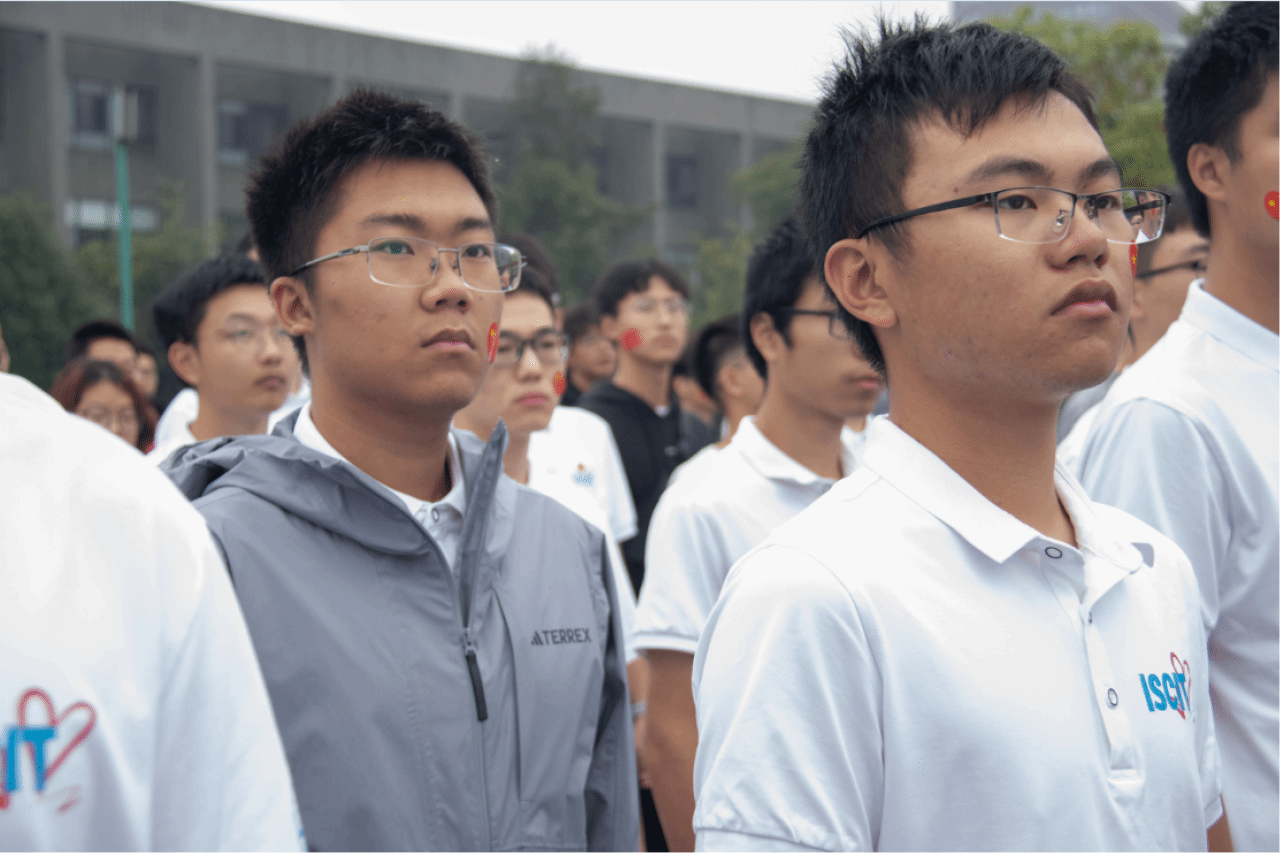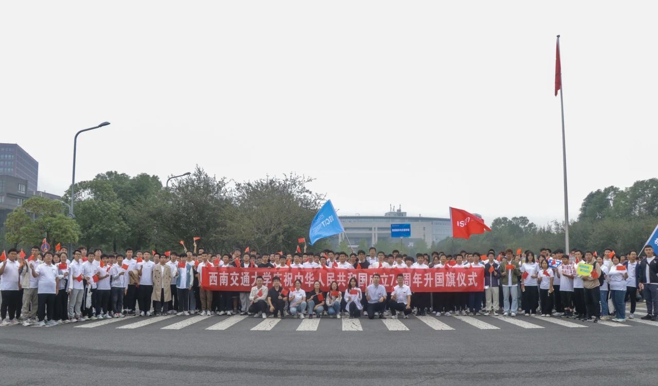 公司师生身着文化衫,党员、团员同志佩戴党员徽章、团徽,深情地唱出对祖国的清澈爱恋。在红旗的映衬下,交大校园生机盎然,智慧学子斗志昂扬。