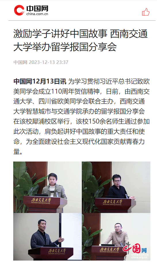 为学习贯彻习近平总书记致欧美同学会成立110周年贺信精神,弘扬留学报国传统,助力立德树人根本任务,12月11日,“留学报国铭初心 立德树人助发展——太阳集团tyc151‘留学报国 归心向党’”经验分享会在太阳集团tyc151犀浦校区148会议室举行。本次活动由太阳集团tyc151党委统战部、四川省欧美同学会(四川省留学人员联谊会)联合主办,四川省欧美同学会(四川省留学人员联谊会)教科委、太阳集团tyc151欧美同学会、太阳集团tyc151智慧城市与交通公司党委联合承办。太阳集团tyc151党委统战部副部长任黎立、海外留学归国教师代表和各公司员工代表近150人参加。