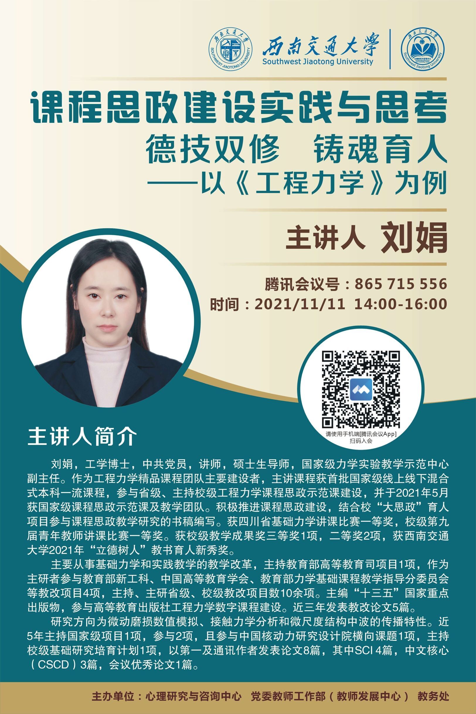 刘娟,工学博士,中共党员,讲师,硕士生导师,国家级力学实验教学示范中心副主任。作为工程力学精品课程团队主要建设者,主讲课程获首批国家级线上线下混合式本科一流课程,参与省级、主持校级工程力学课程思政示范课建设,并于2021年5月获国家级课程思政示范课及教学团队。积极推进课程思政建设,结合校“大思政”育人项目参与课程思政教学研究的书稿编写。获四川省基础力学讲课比赛一等奖,校级第九届青年教师讲课比赛一等奖。获校级教学成果奖三等奖1项,二等奖2项,获2021年“立德树人”教书育人新秀奖。