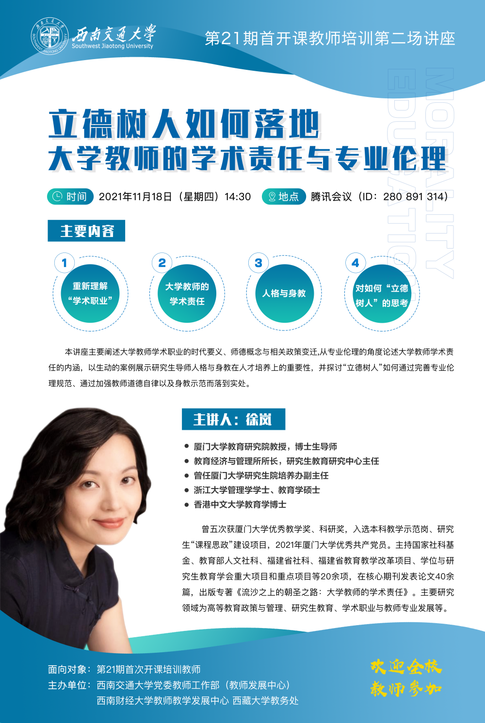 本讲座主要阐述大学教师学术职业的时代要义、师德概念与相关政策变迁,从专业伦理的角度论述大学教师学术责任的内涵,以生动的案例展示研究生导师人格与身教在人才培养上的重要性,并探讨“立德树人”如何通过完善专业伦理规范、通过加强教师道德自律以及身教示范而落到实处。