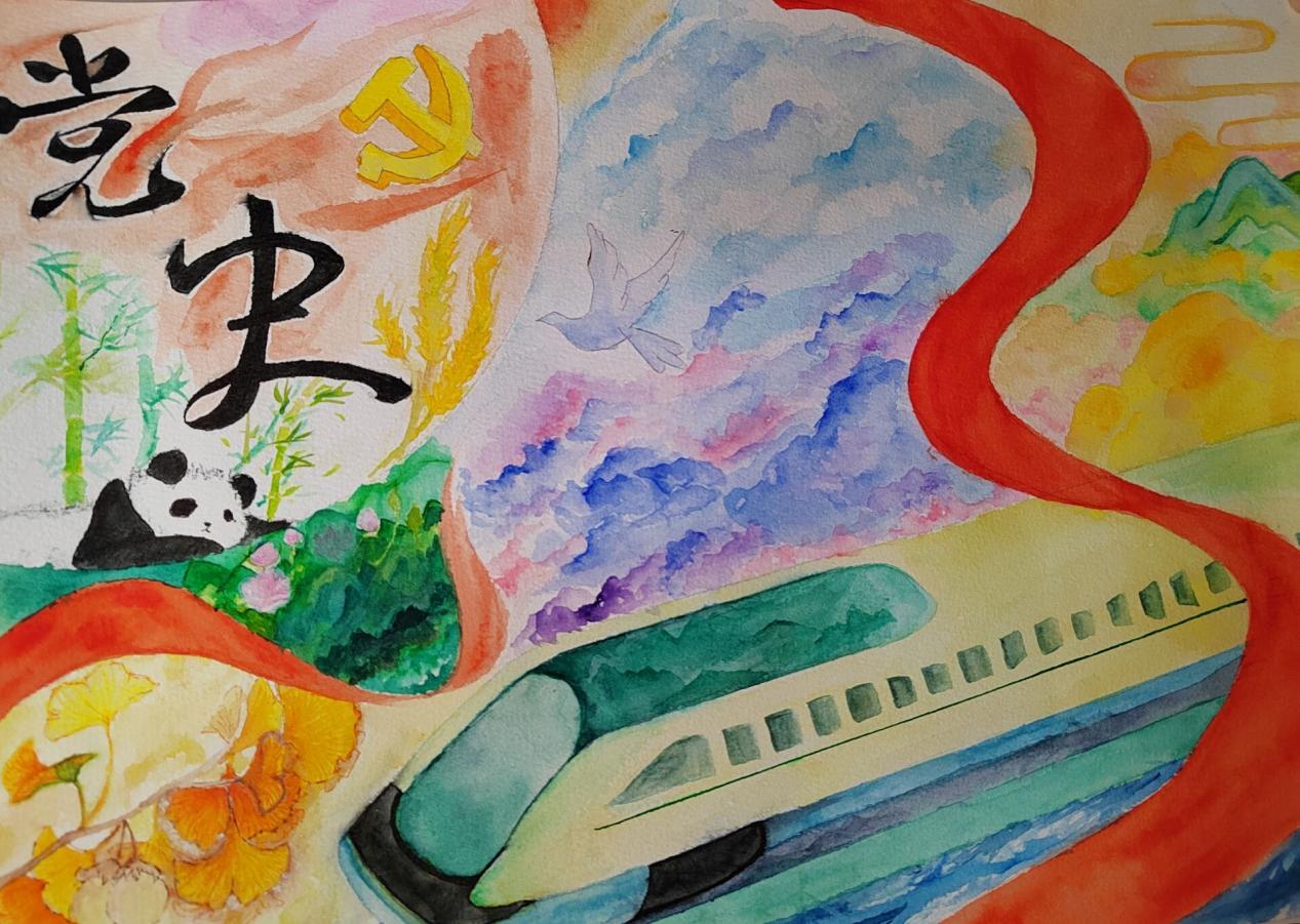 本作品蕴含着“党史”“跨越春夏秋冬的高铁”“飘扬的红色丝带”“熊猫”等元素。图画中银杏和熊猫寓意为“天府之国”,高铁彰显着公司“天地交而万物通”的崇高意境,且与党史元素交相辉映。全图意涵丰富,立意深远。