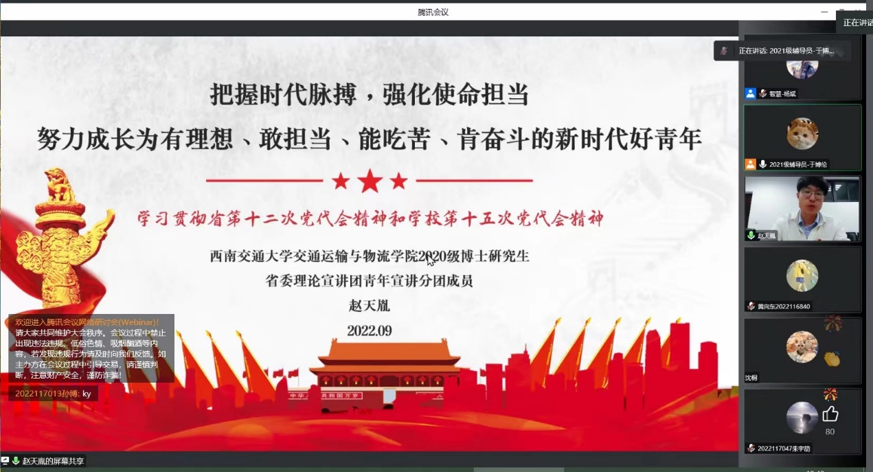 9月23日,公司党委举行四川省第十二次党代会精神和公司第十五次党代会精神专题学习会,四川省委理论宣讲团青年宣讲分团成员、公司青年讲师团成员、交通运输与物流公司2020级博士研究生赵天胤受邀进行理论宣讲。公司全体教师党员、入党积极分子、团干部以及广大学子参加学习。学习会由公司团委书记于博伦主持。