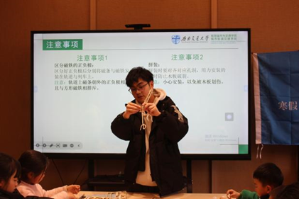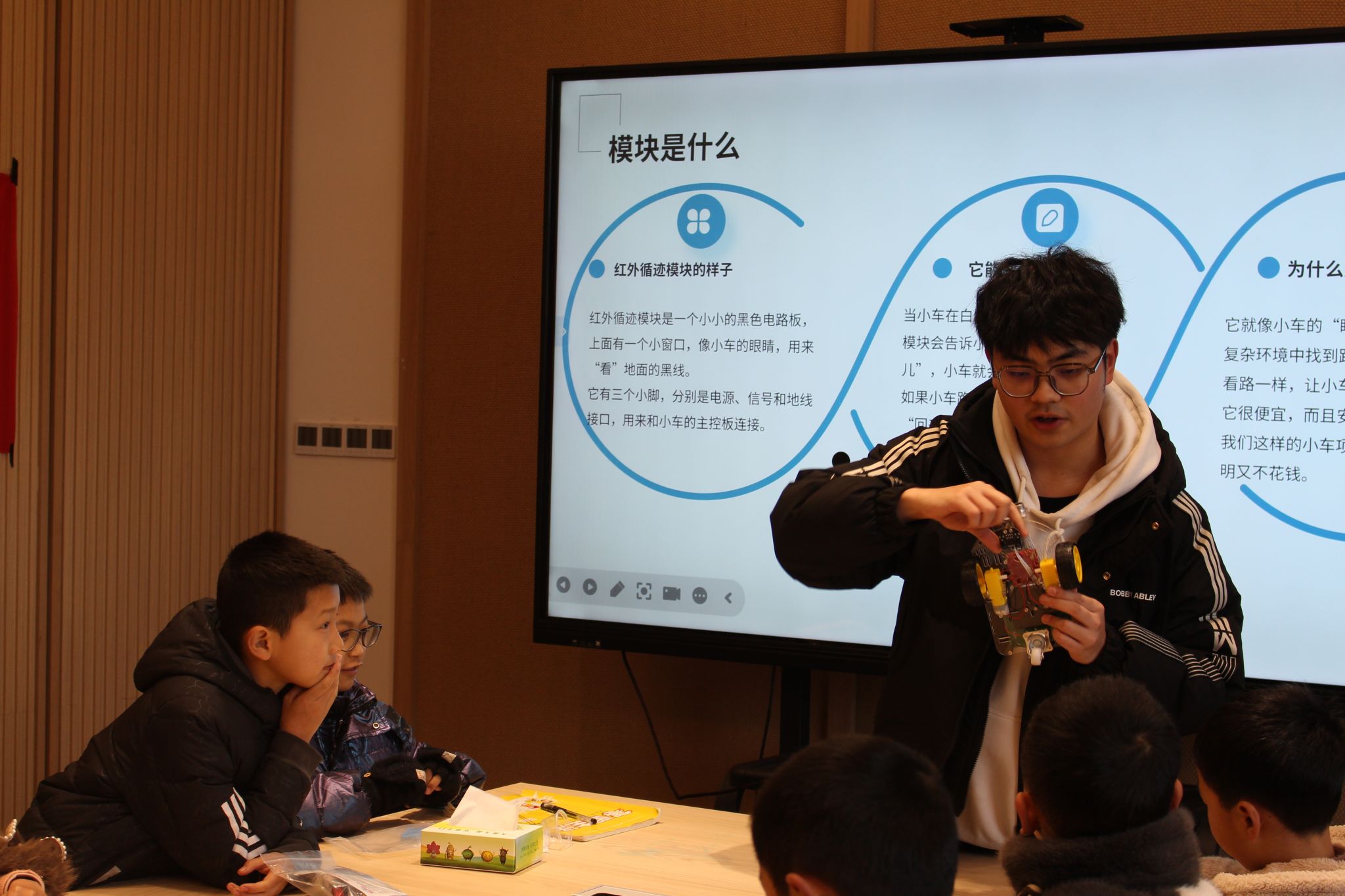 在新工科实践环节,实践队员们充分发挥专业优势,将前沿科技与乡村教育紧密结合,为乡村员工带来了一场科技盛宴。活动中,实践队员们首先向员工们介绍了循迹避障小车的工作原理,通过生动的讲解和现场演示,让员工们直观感受到智能科技的魅力。员工们在实践队员的指导下,动手组装了循迹避障小车的轨道并对小车进行调试,体验科技带来的乐趣。这一过程不仅锻炼了员工的动手能力,也激发了他们对智能科技的兴趣。
