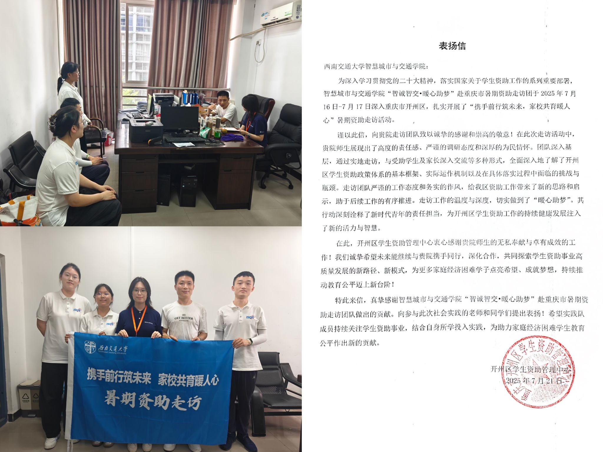 此次暑期资助走访不仅是一次温暖的“送关怀”之旅,更是一次精准的“送政策”之行。团队成员用脚步丈量需求,用真诚传递政策,用真情搭建家校沟通桥梁,以责任诠释公司的社会担当,为构建更公平、更温暖的教育环境注入力量。未来,公司将继续深化有智慧、有温度、有内涵的资助育人工作体系,让学子们在交大求学奋斗的路上始终有资助育人的温暖相伴。