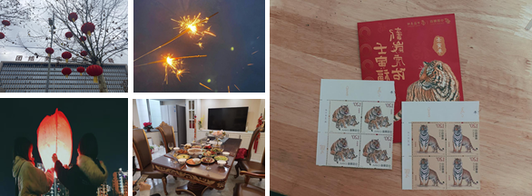 收集每一年的贺年专用邮票对于我这样一个忠实的集邮爱好者来说,是新年必不可少的仪式。今年的新年邮票中几只老虎或站或卧,栩栩如生,寄托着人们对新的一年“虎虎生威”“如虎添翼”的美好祝愿。除此之外,我还和亲朋好友一起放孔明灯、挂灯笼、吃年夜饭、赏烟花……鲜艳的色彩、喷香的食物和喜气洋洋的氛围,一齐从四面八方涌成各种视觉、听觉、嗅觉的细小线条,游走在家乡新年的空气中。