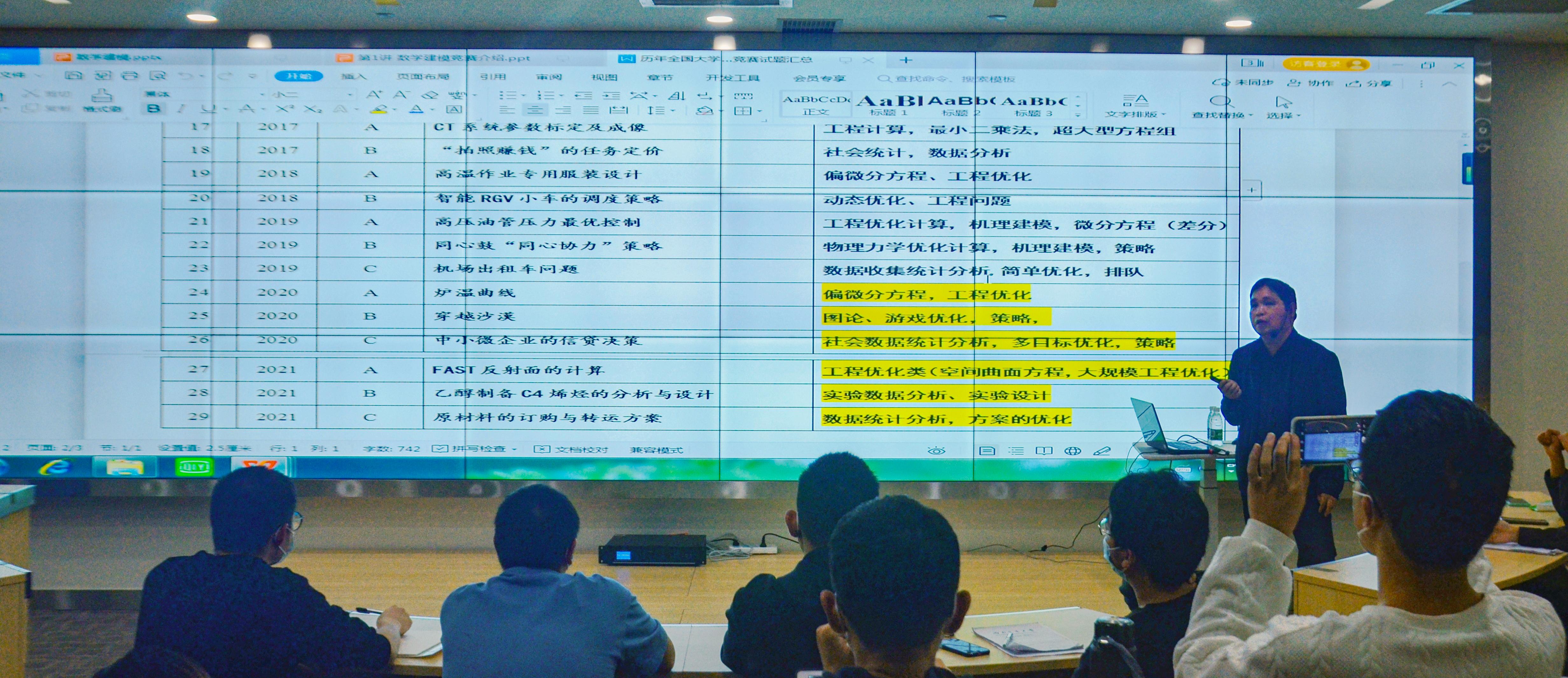 随后,徐老师以数学建模题目为例,深入浅出地阐释数学建模的全过程,从模型建立、模型求解,到结果分析、模型检验……徐老师详细讲授数学建模的每一步,带领同学们走进数学建模的大门。徐老师向同学们讲到,数学建模与其说是一门技术,不如说是一门艺术。在建模过程中可以极大提高参赛者的想象力、洞察力、判断力和创新意识,希望同学们在比赛中循序渐进地提升自己的数学建模能力。