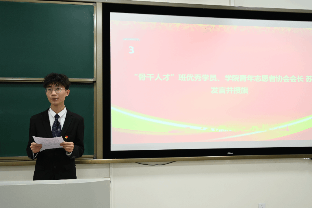 随后,苏涛同学为“储备人才”培训班授旗,新学员代表黄焱明同学接旗,现场气氛鼓舞人心。