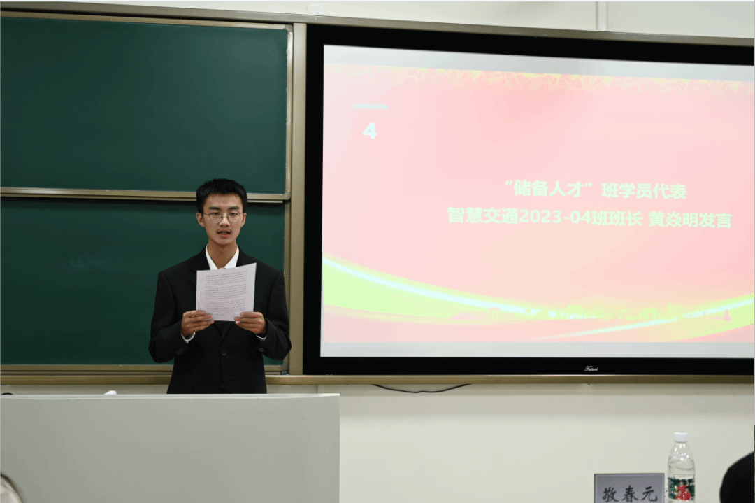 智慧交通2023-04班黄焱明同学代表“储备人才”班学员发言。他首先为学员们讲述了当代青年学习和实践马克思主义的重要意义,他表明作为新时代中国青年,要牢记习近平总书记的殷殷嘱托:“坚持把马克思主义基本原理同中国具体实际相结合、同中华优秀传统文化相结合,用马克思主义观察时代、把握时代、引领时代,继续发展当代中国马克思主义、二十一世纪马克思主义。”