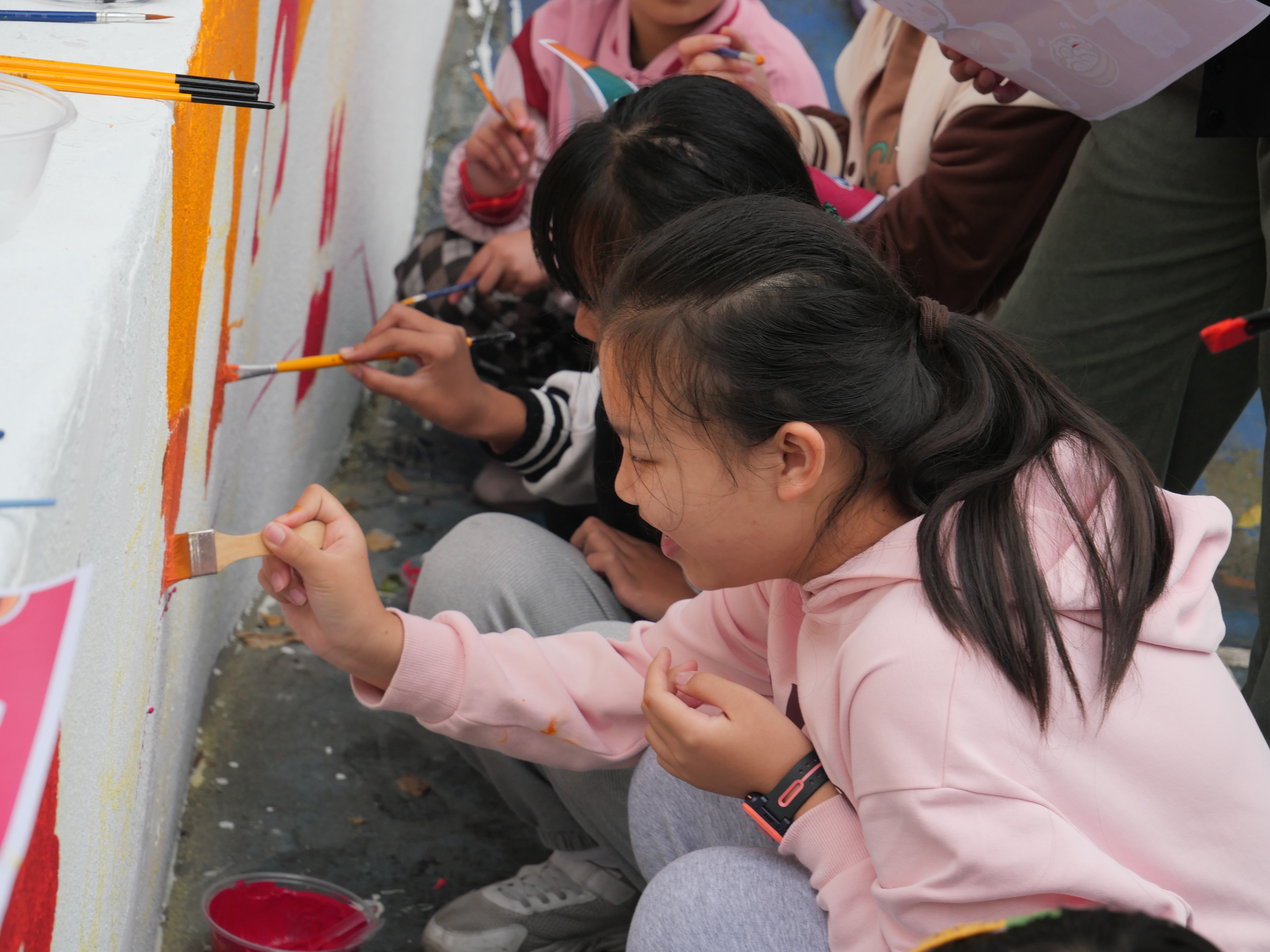在前期准备时,同学们结合专业知识,融合童年元素,共同完成墙绘图案设计工作。