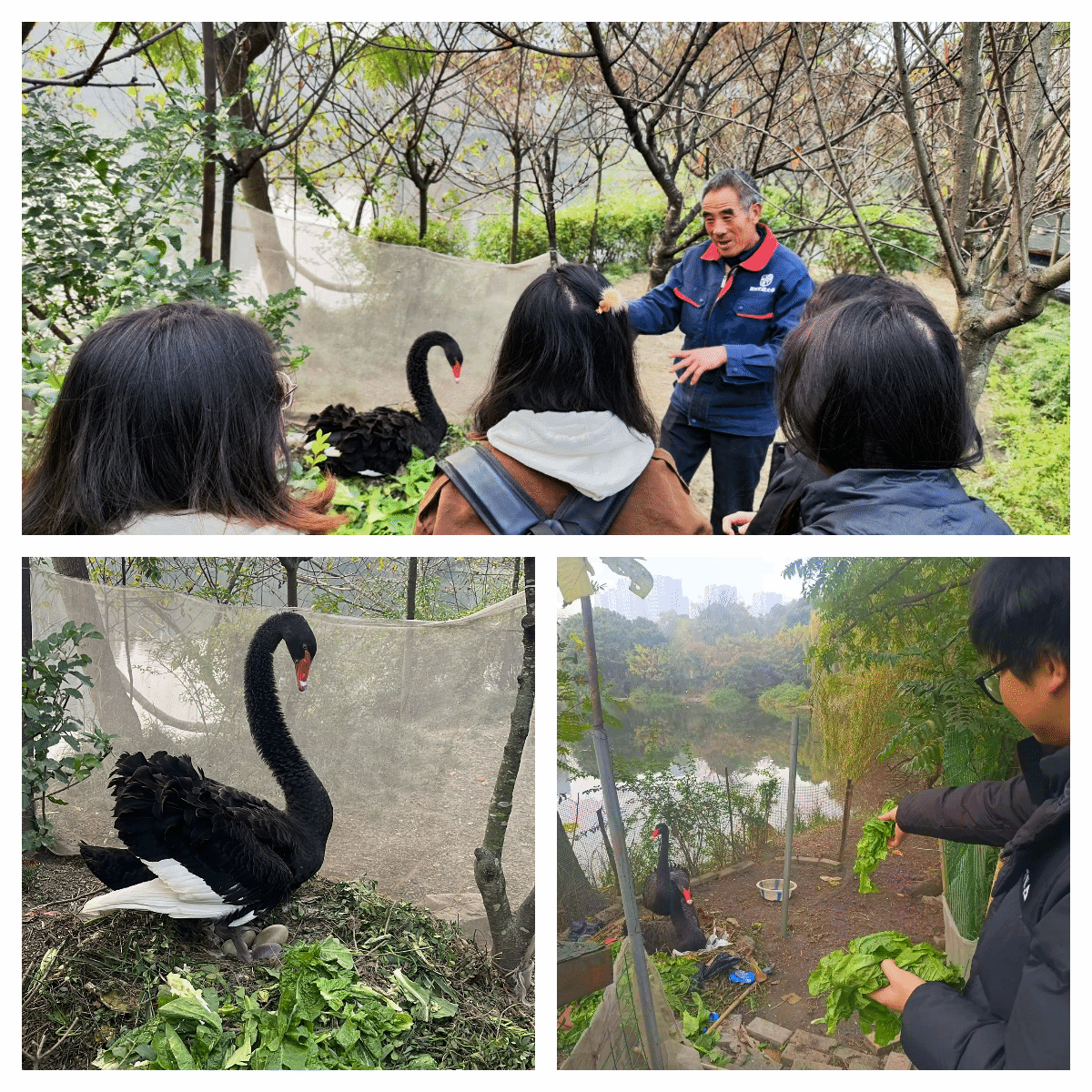 部分员工还在樊师傅的带领下,坐船来到了位于犀湖中心的鹅舍,近距离观察并喂食黑天鹅。在樊师傅的介绍下,学习天鹅的繁殖、迁徙、社交、食性、寿命等相关知识。