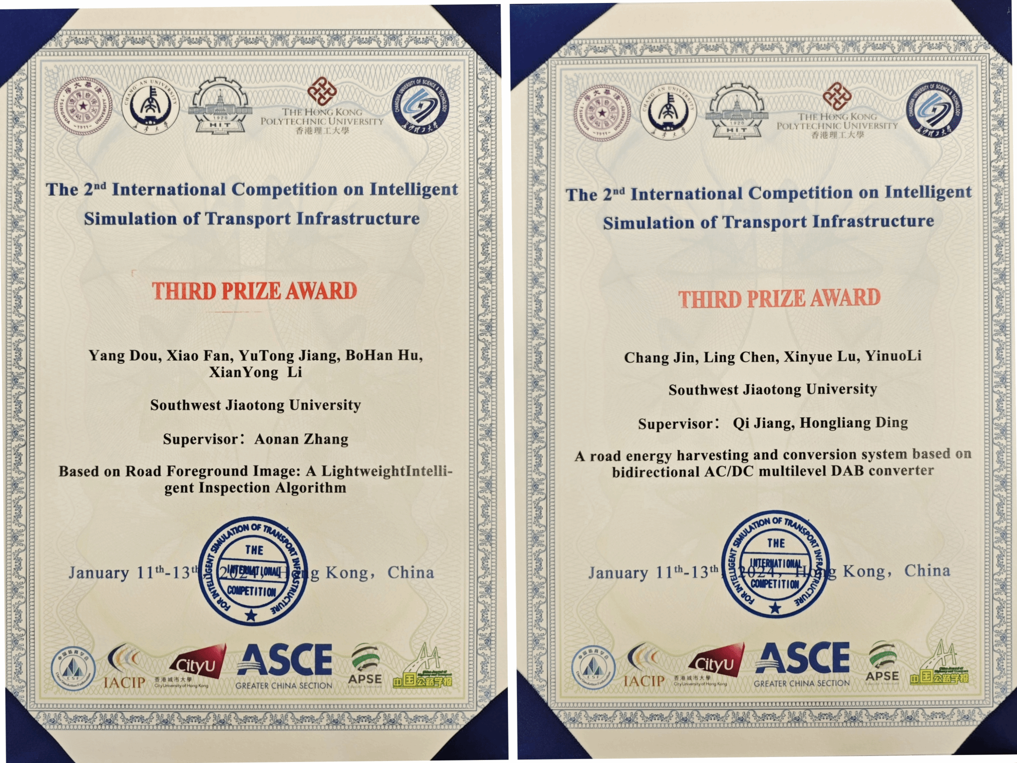 近期,第二届国际交通基础设施智能仿真大赛组委会公布了2023年大赛获奖名单。公司2021级智能建造专业窦杨、樊潇、蒋雨桐、胡博涵、李先勇和智能制造工程专业陈玲、金畅,新能源科学与工程专业李依诺、卢欣悦9名同学参与的两支队伍均获得三等奖,这是公司本科生首次参加国际学科竞赛并获得奖项。