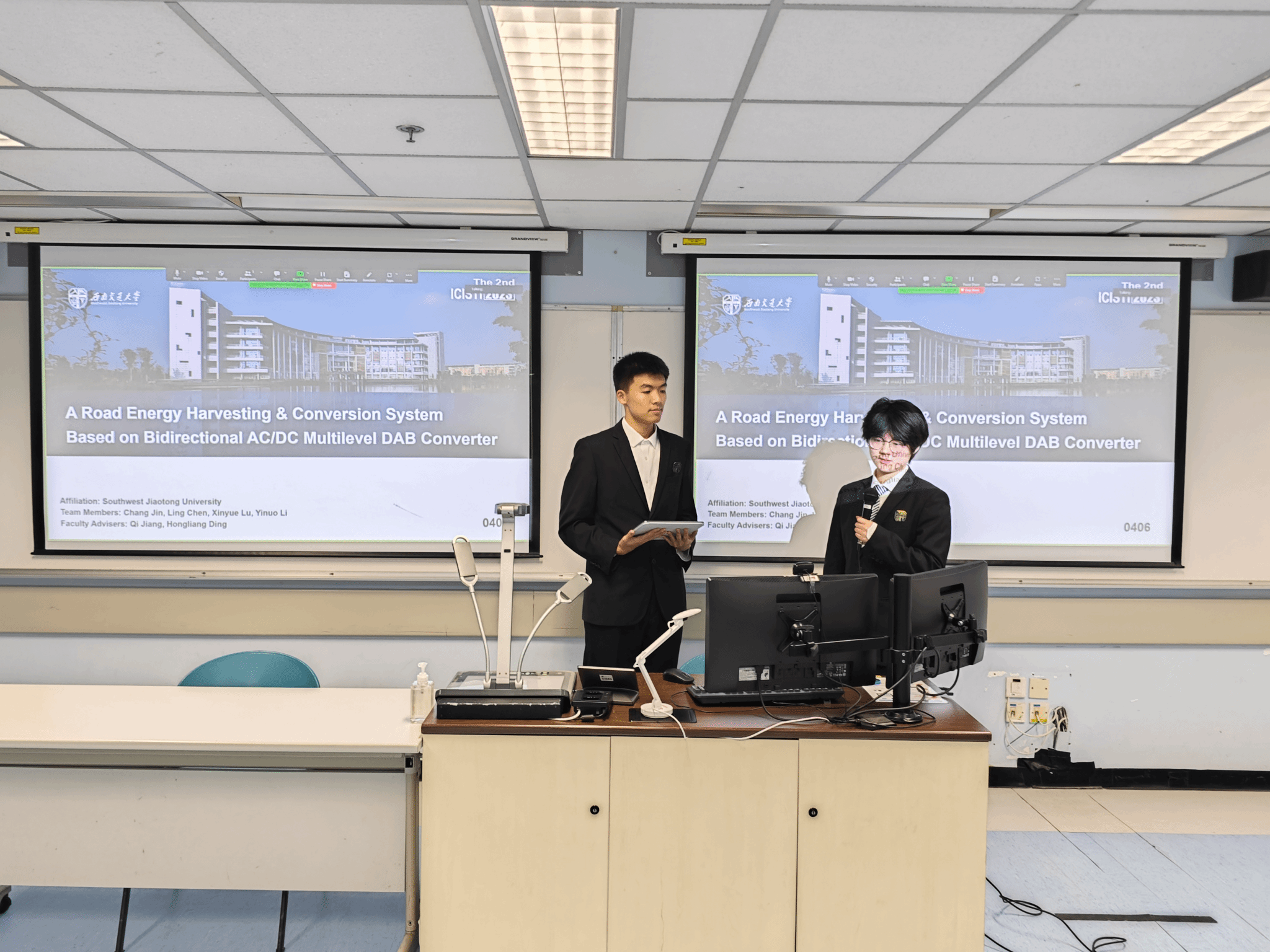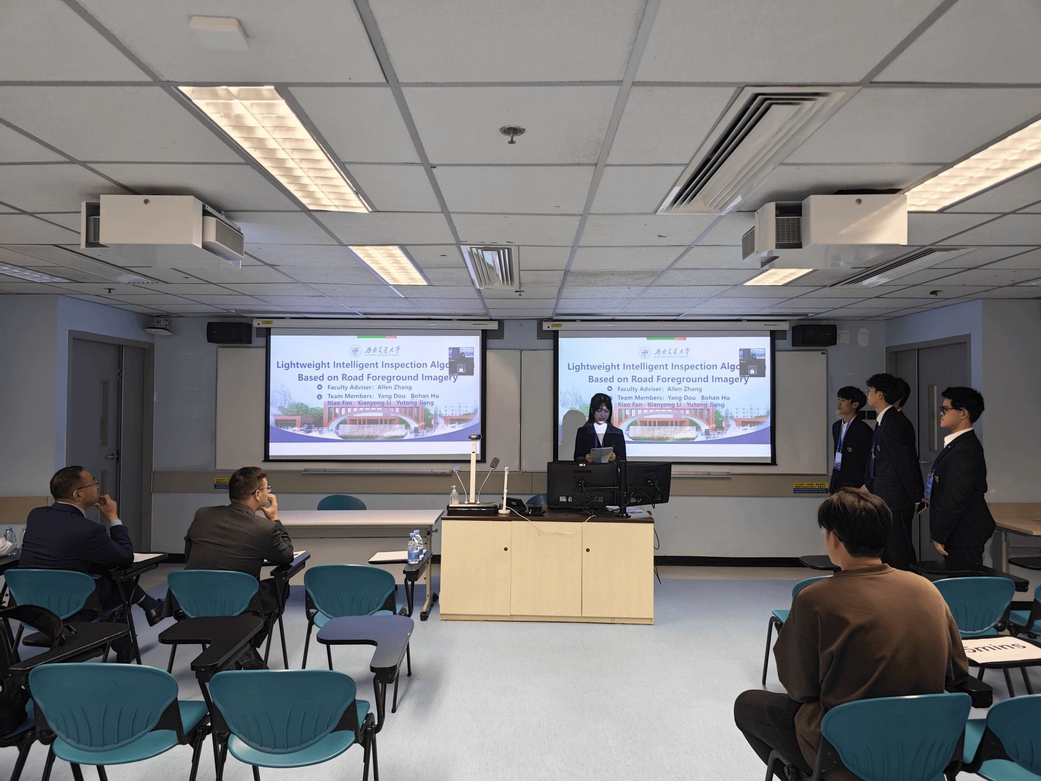 决赛中,公司参赛队伍分别以Based on Road Foreground Image: A Lightweight lntelligent Inspection Algorithm(基于道路前景图像的轻量化智能巡检算法)和A road energy harvesting and conversionsystem based on bidirectional AC/DCmultilevel DAB converter(基于双向AC/DC多电平DAB转换器的道路能量收集与转换系统)为题,全程使用英文陈述和探讨了利用人工智能深度学习技术来精准、快速掌握道路交通资产、路面病害的状况及相关统计数据和“道路能量”的收集储存及直流电与交流电高效率转换问题,并根据评委现场提问进行答辩。