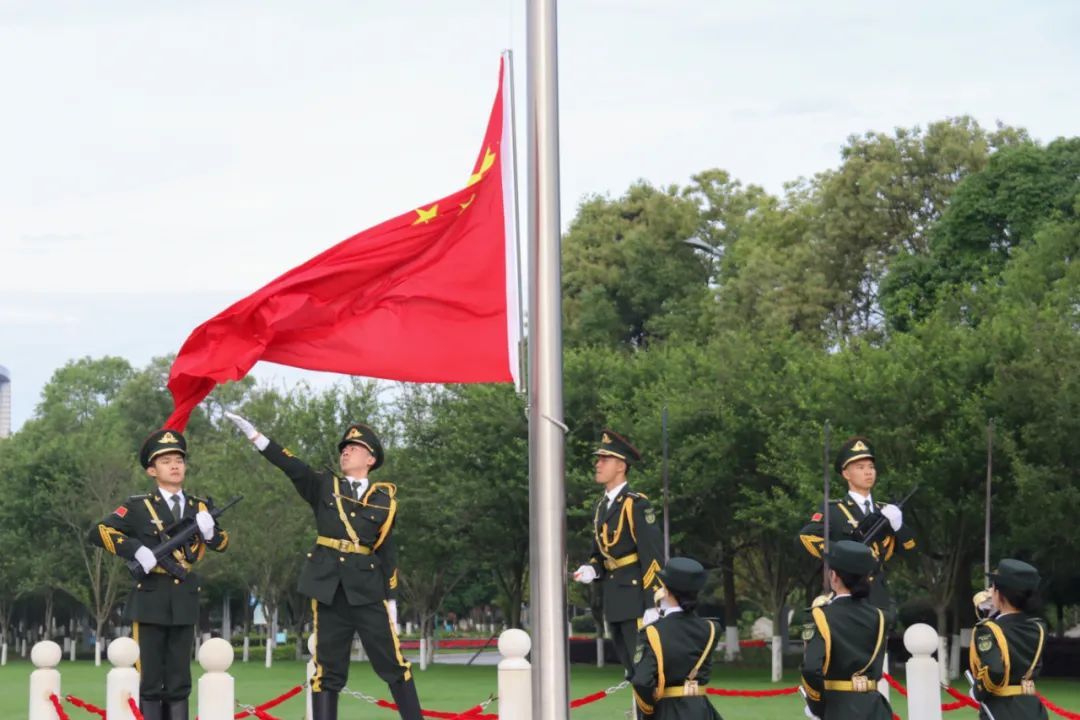 上午8时整,升国旗仪式隆重举行。英姿飒爽的国旗护卫队队员们喊着洪亮的口号,踏着沉稳而坚定的步伐,护送鲜艳的五星红旗向国旗台走来。伴随着庄严的《义勇军进行曲》,国旗迎风飘扬,冉冉升起。全体师生肃立,面向国旗行注目礼,坚毅的目光随国旗达到最高处,心中深怀对祖国无限热爱与崇高敬意。
