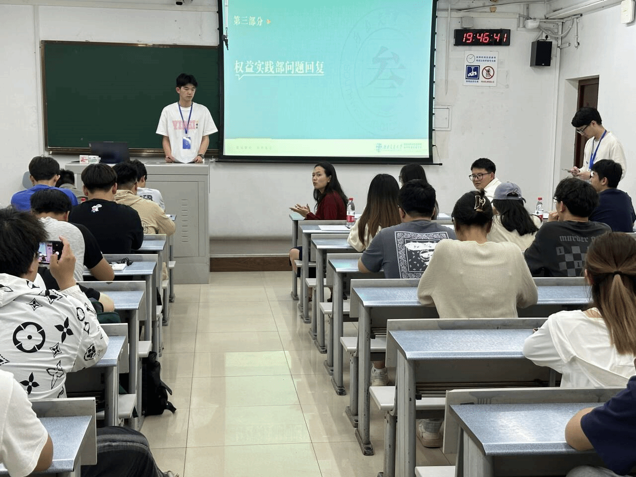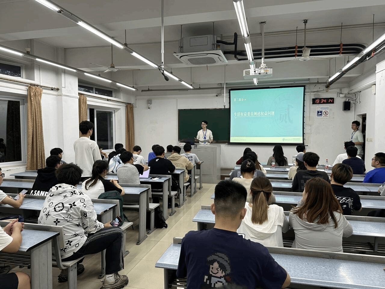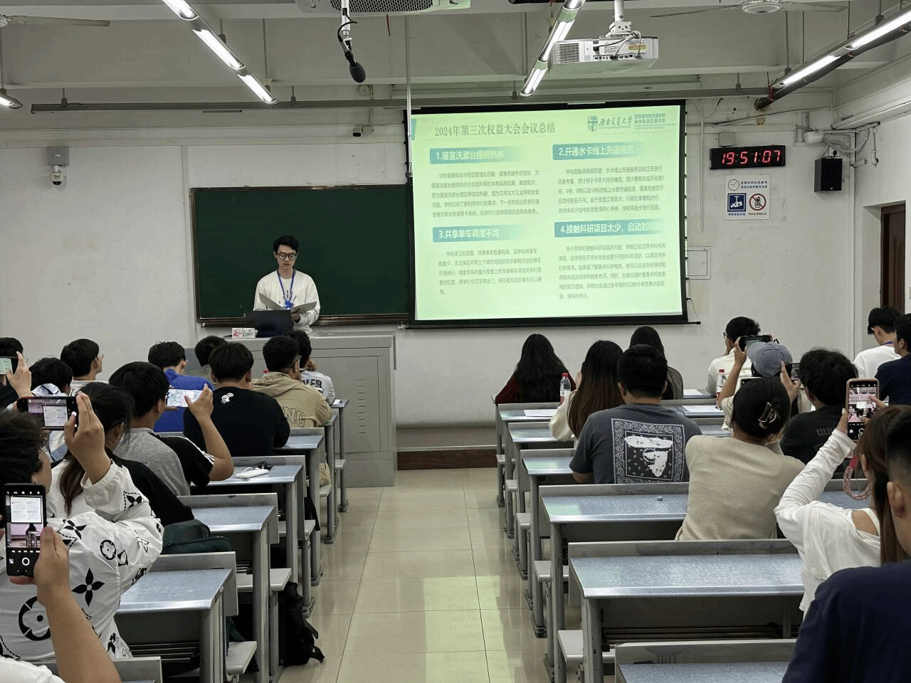 其次,陈世鸿邀请各班生活权益委员代表班级阐述权益问题,各班权益委员积极发言,权益部工作人员针对各个权益问题一一进行解答。