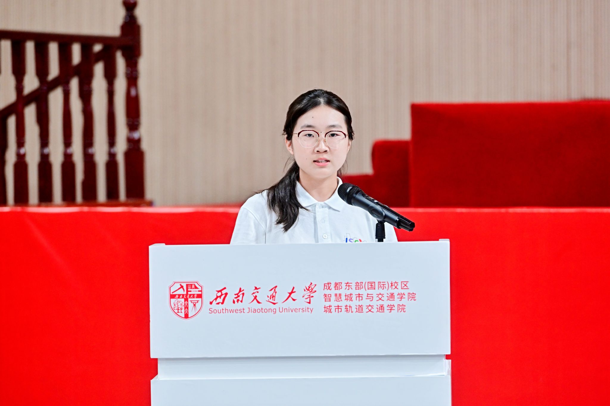 智慧交通2024-01班许天资作为新生代表发言。“想,都是问题;做,才是答案”!她认为,人生只有走出来的美丽,没有等出来的辉煌,所以拒绝拖延,敢想敢做才是硬道理。她与在座全体新生共勉,期待与同学们并肩前行,收获成长。