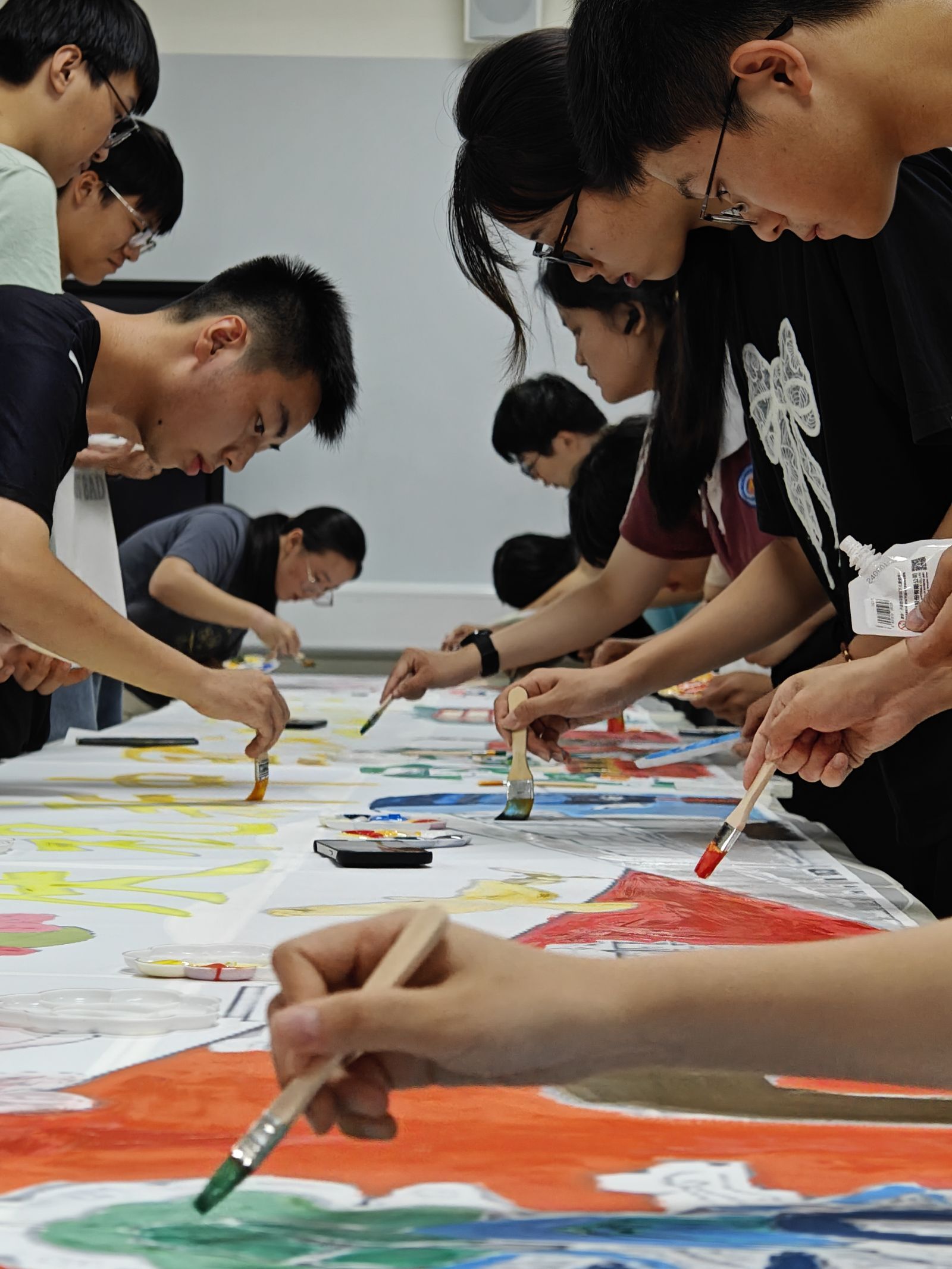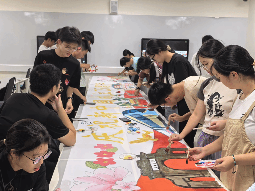 活动现场,气氛热烈。同学们平展铺开画布,手持画笔,调色构思,全神贯注地投入到画卷创作中。在绘制过程中,同学们互相交流、互相协作,用色彩表达着对祖国的祝福,用画笔传递着对祖国的深情。