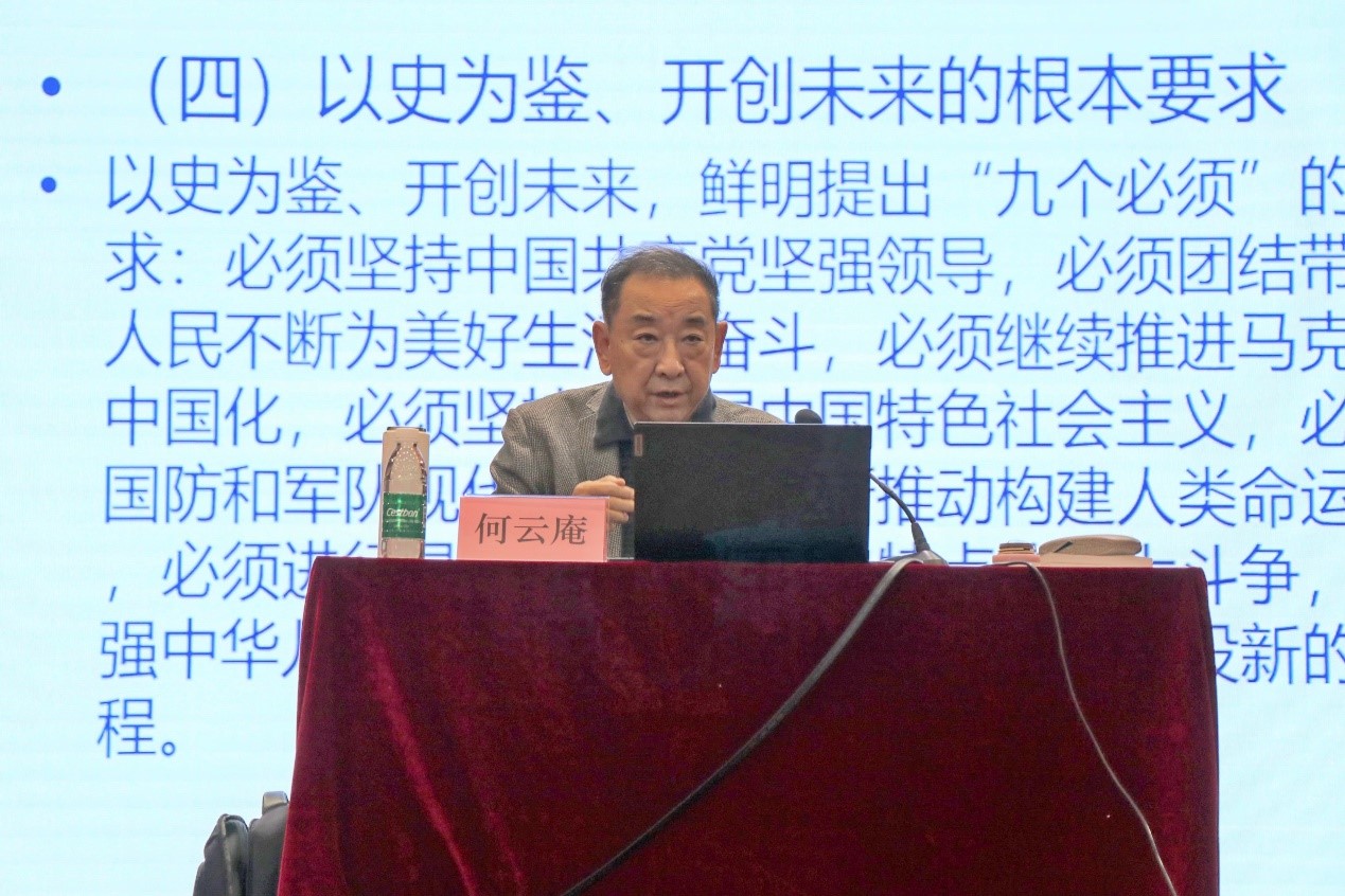 何云庵以“学习伟大建党精神,以史为鉴开创未来--学习习近平总书记‘七一’讲话精神体会”为题,从“七一”讲话的重点内容,学习伟大建党精神的初步体会,以史为鉴,开创未来的根本要求三个部分,对习近平总书记“七一”重要讲话进行全面系统阐释。他指出,习近平总书记“七一”重要讲话是引领全党全国人民立足新起点、接力新征程的科学指南和行动纲领,贯穿着辩证唯物主义和历史唯物主义的世界观方法论,提出了一系列新的重大思想、重大观点、重大论断,进一步丰富和发展了习近平新时代中国特色社会主义思想,集中体现了当代中国马克思主义、21世纪马克思主义的最新理论成果。他强调,习近平总书记“七一”重要讲话对广大青年提出了殷切期望,青年是祖国的未来、民族的希望,也是我们党的未来和希望,中华民族伟大复兴终将在一代代青年的接力奋斗中变为现实。
