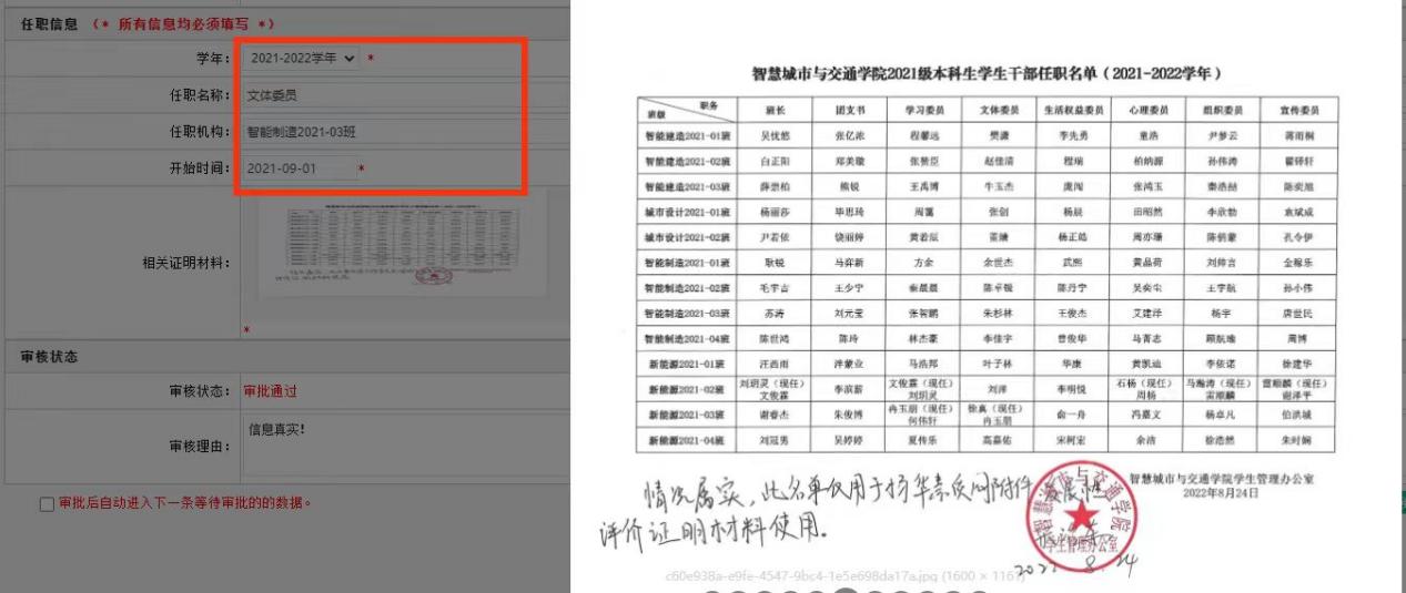 学年勾选2024-2025学年,任职名称、任职机构填写完整,班委任职机构按照“智能建造2022-01班”格式填写,相关证明材料需上传任职证明或加盖公章证明(扫描版),示例如下: