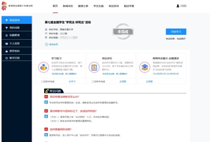 本次学习以班级为单位,各班组织同学在教育部全国青少年普法网开展在线学习、课后联系、成果检测等,于10月9日前完成学习。