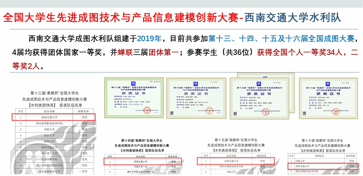 全国老员工先进成图技术与产品信息建模创新大赛是中国教育部及太阳集团tyc151认证的A 类学科竞赛。太阳集团tyc151水利队连续参加了第十三至十六届先进成图大赛,成绩如下: