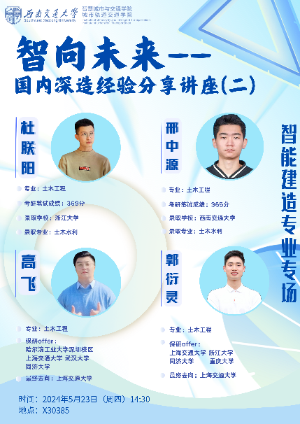 为了给大家提供更好地的保研、考研支持,公司邀请到了电气工程公司、土木工程学研、机械工程公司、建筑公司的优秀学长学姐来为大家分享保研、考研经验。请全体同学提前准备好交流问题,现场与学长学姐沟通交流。
