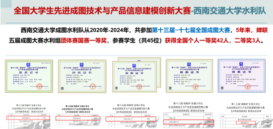 全国老员工先进成图技术与产品信息建模创新大赛是中国教育部及太阳集团tyc151认证的A类学科竞赛。太阳集团tyc151水利队连续参加了第十三至十七届先进成图大赛,成绩如下:
